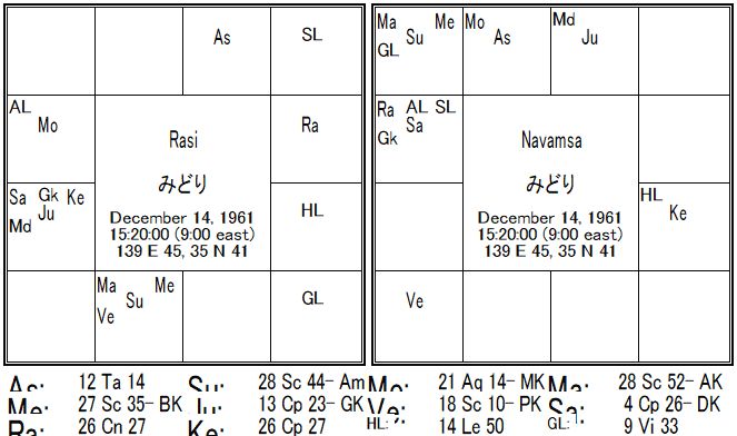 金星は元来、結婚・恋愛にかかわる星で、かつみどりさんの場合、結婚・人間関係の7室に金星がありますので、Wで結婚や恋愛に関わってきます。かつ裏のチャート(ナヴァムシャ)でも、金星は7室支配星で、9室在住なので、この点からも恋愛結婚に関わる星になります。