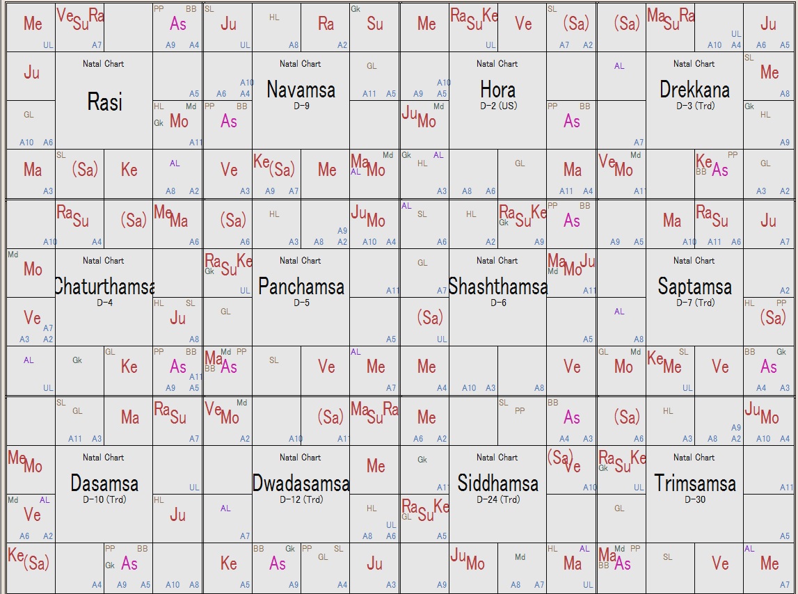 支配は8-9Lと吉凶混合。6H・アスペクトなしでヴィパリタ・ラージャヨガを形成。また凶星に挟まれ、パーパカルタリ状態。ヴァルゴッタマで強い。月へのアスペクトあり。