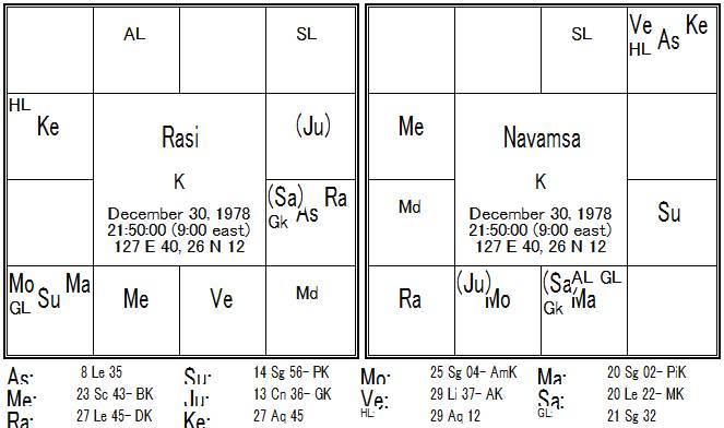 5-12室の星座交換、かつ、この12室(遠くの地)で5Lの木星が高揚・・・遠くの地での幸運を示唆しています。また、この幸運の5室では、ラグナロードの太陽とこの12Lの月がコンジャクトし、それにラージャヨガ・カラカ(超吉星)の火星もコンジャクト、12Lを交えて、1-4-5-9のラージャヨガにチャンドラマンガラヨガ・・・これも遠くでの幸運を示唆しています。