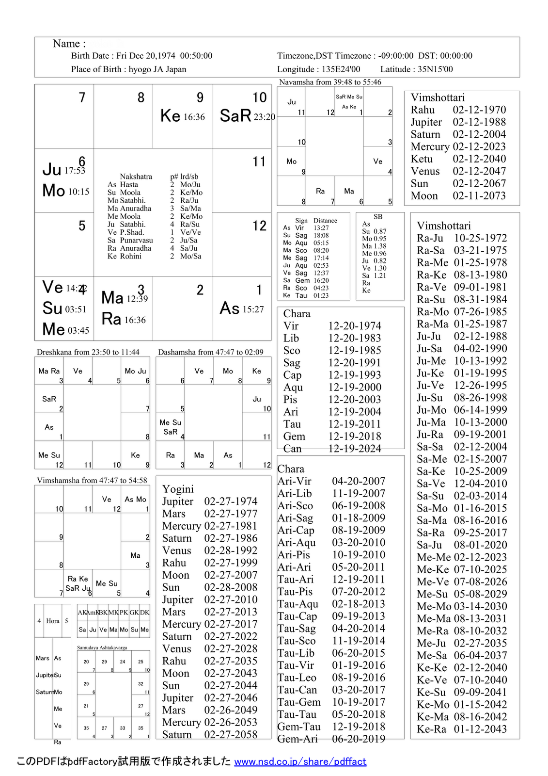 「そしてラージャヨガだけでなくヴィパリータも形成されているので見返す力もある。普通のヴィパリータでは殆ど悪運でおこぼれ程度の逆転で終わりますが、ここまで強いヴィパリータだと成功が比較的大きな規模になります。ただ、これが芸術系の成功かといえば、多分違うでしょう。それはこのヴィパリータ該当時期がダシャムシャ4室に形成される為です(ダシャムシャではヴィパリータではありません)」