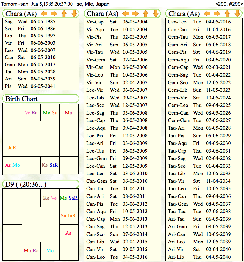 ・インド式には100種を超えると言われる時期読みの手法があると言われます。その中でも、ヴィムショタリーダシャーは王道で、ジャイミニという聖者が編み出したダシャーが、女王と言われたりもしています。ジャイミニの中では、チャラダシャーという星座をベースとしたダシャーが基礎的なものとしてあります。そのチャラダシャーでは、今は蟹座ー獅子座期です。1-2であり、収入面での流れが来ていると見えます。2016年11月からは蟹座ー蟹座期で、精神性への傾倒が強まる流れに伺えます。2017年6月からは大きな流れが変わり、基本が双子座になります。双子座ー牡牛座期になり、1-12の流れなので、外国との縁が強めになるのかもしれません。