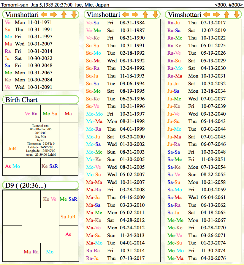・現在はラーフ・ラーフ期であり、ラーフの象意である外国の縁とか突然の変化などが強まる時期に伺えます。次のラーフ・木星期は、2017年7月から2年強ですが、その時期は、ラーフから木星は、出生チャートでは1-10で仕事面の力が来る流れで、ナヴァムシャでは1-9で、精神性の向上や、大きめの移動・巡礼などの相と言えるかもしれません。D10においては、1-5で学びに良い相と見えます。