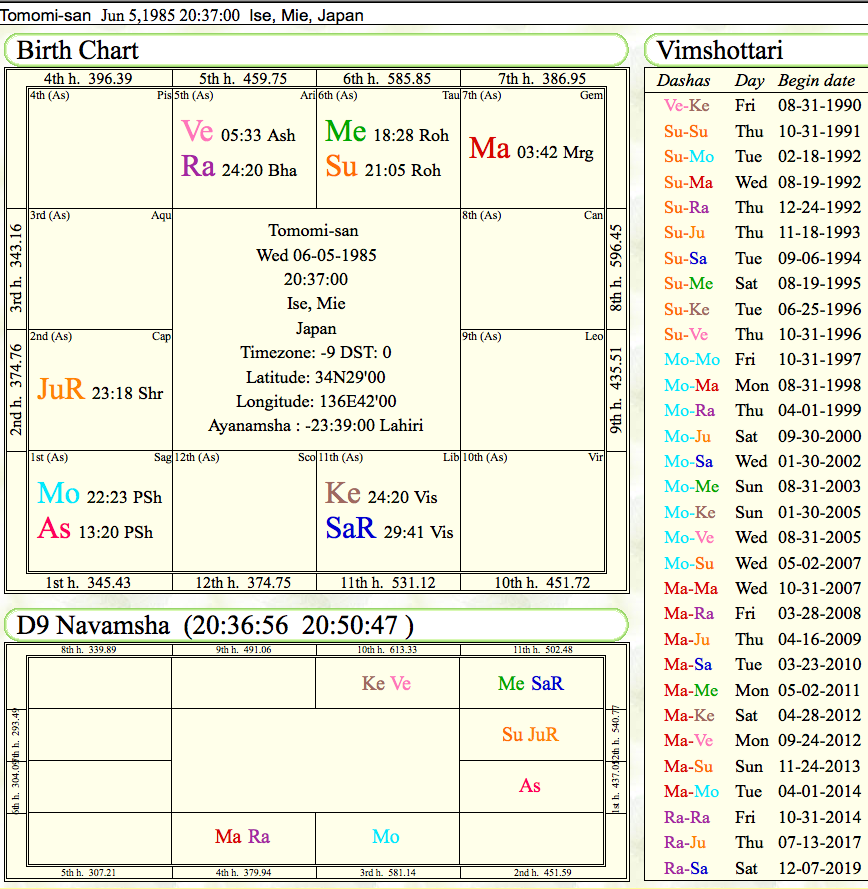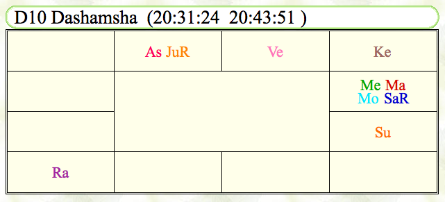 ・チャートとして、出生チャートは当然ながら、インド式は「分割図」も重要ですので、分割図として重要な「9分割図」の「ナヴァンシャ(D9)」と、職を見る際に一般的に参照される「10分割図(D10)」の「ダシャンシャ」も見ます。それぞれ、画像を添付いたしましたのでご参照ください。