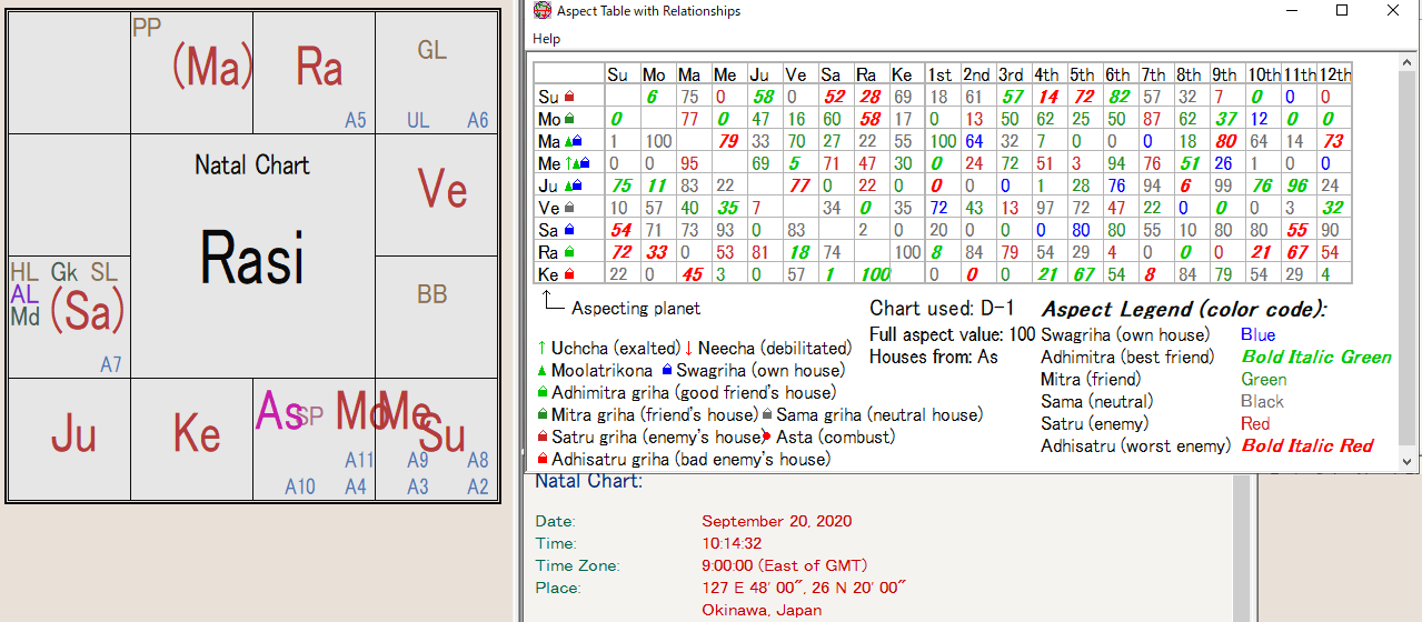 先日、無料鑑定掲示板で鑑定していただいたGILと申します。 無料鑑定掲示板では丁寧な鑑定をしていただき、とても勉強になりました。 本当にありがとうございます。 現在は、インド占星術comさんが紹介されているJagannatha Horaの使い方を勉強中です。 多くの機能があり、まだまだ試行錯誤の段階ではありますが その中でも、Aspect Table with Relationshipsという機能について知りたいと思い、 詳しい方にご教授願えればと、スレッドを作成させてもらいました。 ソフトの機能については、スクリーンショット画像を添付しています。 (D1とそのD1のAspect Table with Relationships) ハウスや天体などの関係性が数値化され、 品位によってカラーが異なっているようですが これらの表を、ハウスや天体の関係性(アスペクト)を学ぶための 参考にしても問題ないでしょうか? 例えばですが、SuとSaの関係が何故、 Bold Italic Red54で最悪の敵なのかを D1チャートを見て照らし合わせながらそのハウスや天体の関係性を理解していく、 というようなやり方です。 (いまだにSuとSaが最悪の敵になるのは何故かわかっていませんが…。) また、その見方自体が間違っているようでしたら、 ご指摘いただけるとありがたいです。 お時間のある時に教えていただければと思います。 何卒よろしくお願いいたします。