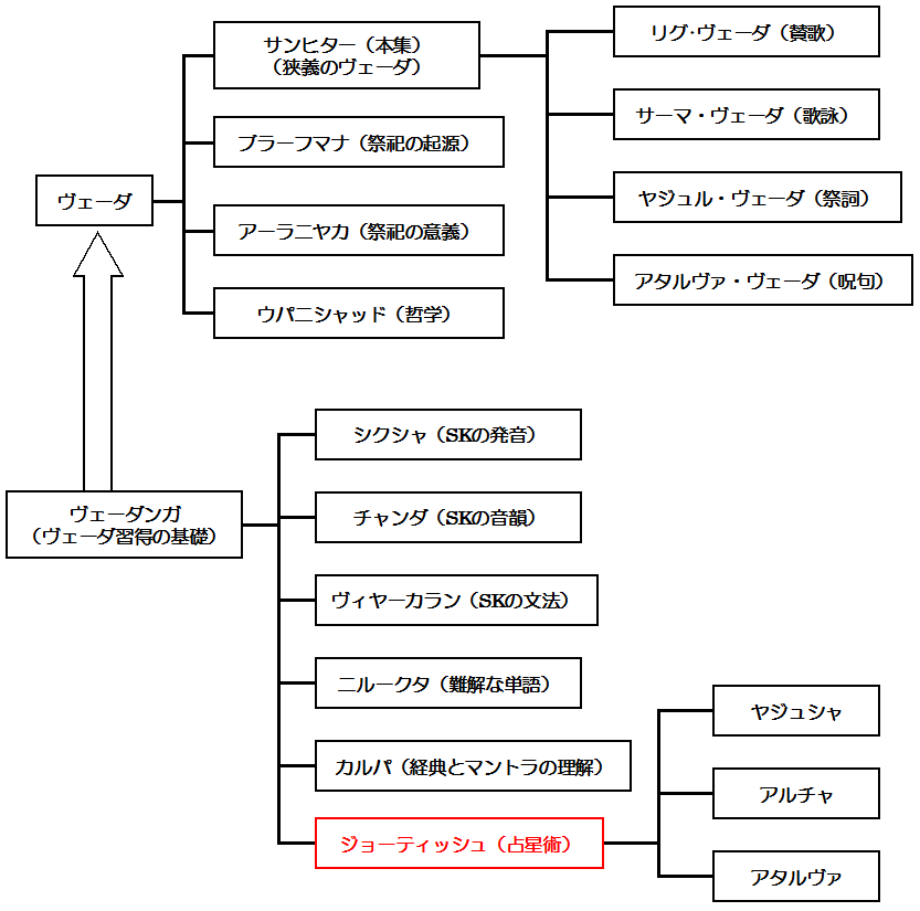 難解なヴェーダを読み解くためには、事前に修めなければならない6つの教えがあり、それらをヴェーダンガ(Vedanga=ヴェーダの手足) と呼びます。6つとは、Shiksha(サンスクリットの発音)、Chhanda(サンスクリットの音韻)、 Vyakarana(サンスクリットの文法)、 Nirkta(難解な単語の説明)、 Kalpa(経典の理解ととマントラの利用)、Jyotisha(占星術)です。