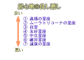 | ハウスや星座の在住星は、建物の店子あるいは住人であると説明しました。 住人の立場に立ってみれば、居心地の良い建物(あるいは土地)とそうでない建物(あるいは土地)があります。 例えば、単純に考えて、大家が自分の家に住むのは、他人の家に住む場合よりも居心地がいいものです。仮に他人の家に住むとしても、その人と仲が良い場合とそうでない場合とでは、やはり居心地の良し悪しが違います。 インド占星術には、在住星の居心地の良し悪しを判断する基準があり、この概念は、鑑定においてとても重要になってきます。 一般に、居心地の良し悪しを決める要因として、つぎのようなものが考えられるでしょう。 @建物(ハウス)との相性 A土地(星座)との相性 B大家(支配星)との相性 C同居人(他の在住星)との相性 しかし、敷地(星座)と大家(支配星)との関係は一義的に決定されているので、結局、次の3つの要因だけを見ればよいことになります。 @建物(ハウス)との相性 A土地(星座)との相性 B同居人(他の在住星)との相性 |