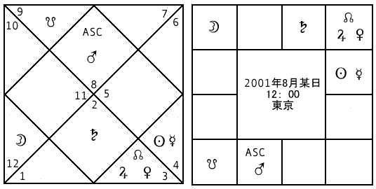 | 星座を土地、ハウスを建物、支配星を大家とすると、次は、店子(たなこ)です。ハウスの住人です。 惑星が、あるハウスあるいは星座にあることを、在住すると言い、その惑星を在住星と言います。 |