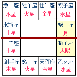 これは星座を支配する惑星をまとめた表ですが、チャートを解読するときには、星座の支配星を、その星座に対応するハウスの支配星としても見なします。 |